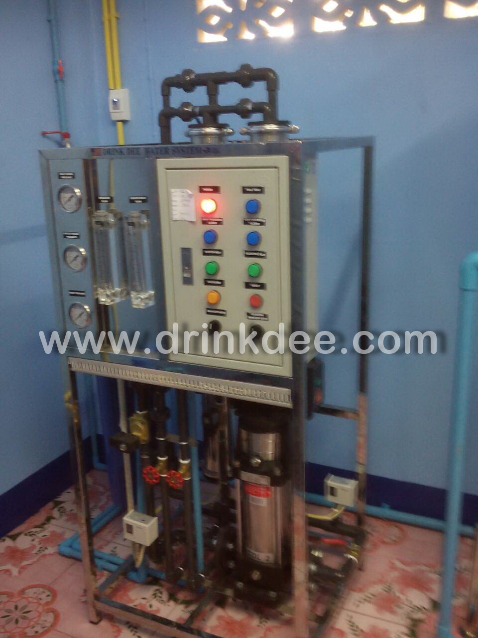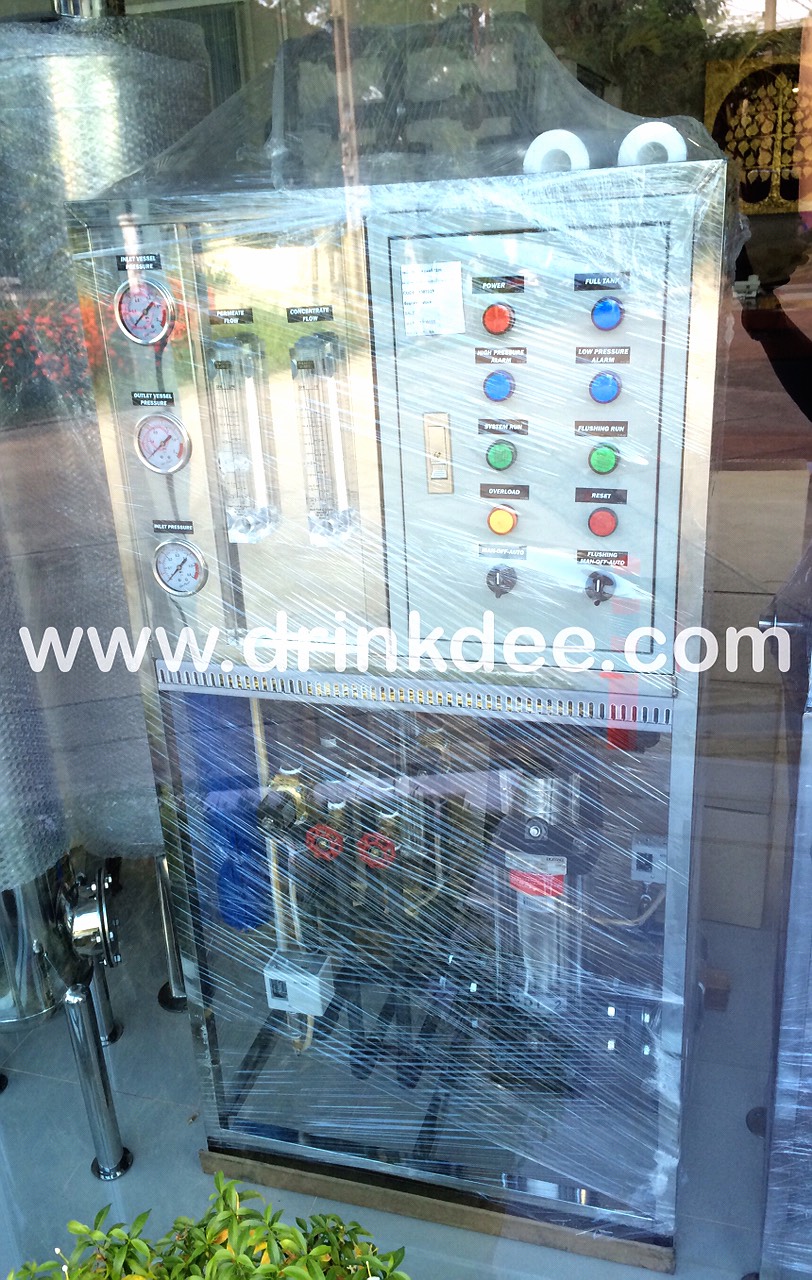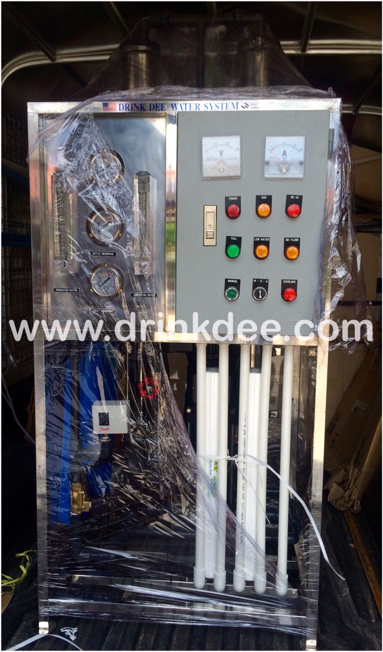เป็นเครื่องกรองน้ำระบบ Reverse Osmosis โดยใช้ไส้กรอง RO ที่มีความละเอียดสูงถึง 0.0001 ไมครอน สามารถกรองสารละลายต่างๆที่ปะปนอยู่ในน้ำให้สะอาดบริสุทธิ์ ไร้เชื้อโรค ตัวเครื่องมีชุดกรอง Pretreatment ด้วยไส้กรอง PP 5 ไมครอน ระบบปั๊มแรงดันสูงเพื่อจ่ายน้ำเข้าสู่เมมเบรน และอุปกรณ์ประกอบชุดกรองเพื่อควบคุมและตรวจวัดการทำงานของระบบ เช่น Pressure Gauge ,Pressure Switch ,Flow Meter ,ระบบ Flushing ล้างทำความสะอาดไส้กรอง พร้อมตู้ควบคุมการทำงานระบบ ใช้งานง่าย สามารถผลิตน้ำได้วันละ 12,000 ลิตร